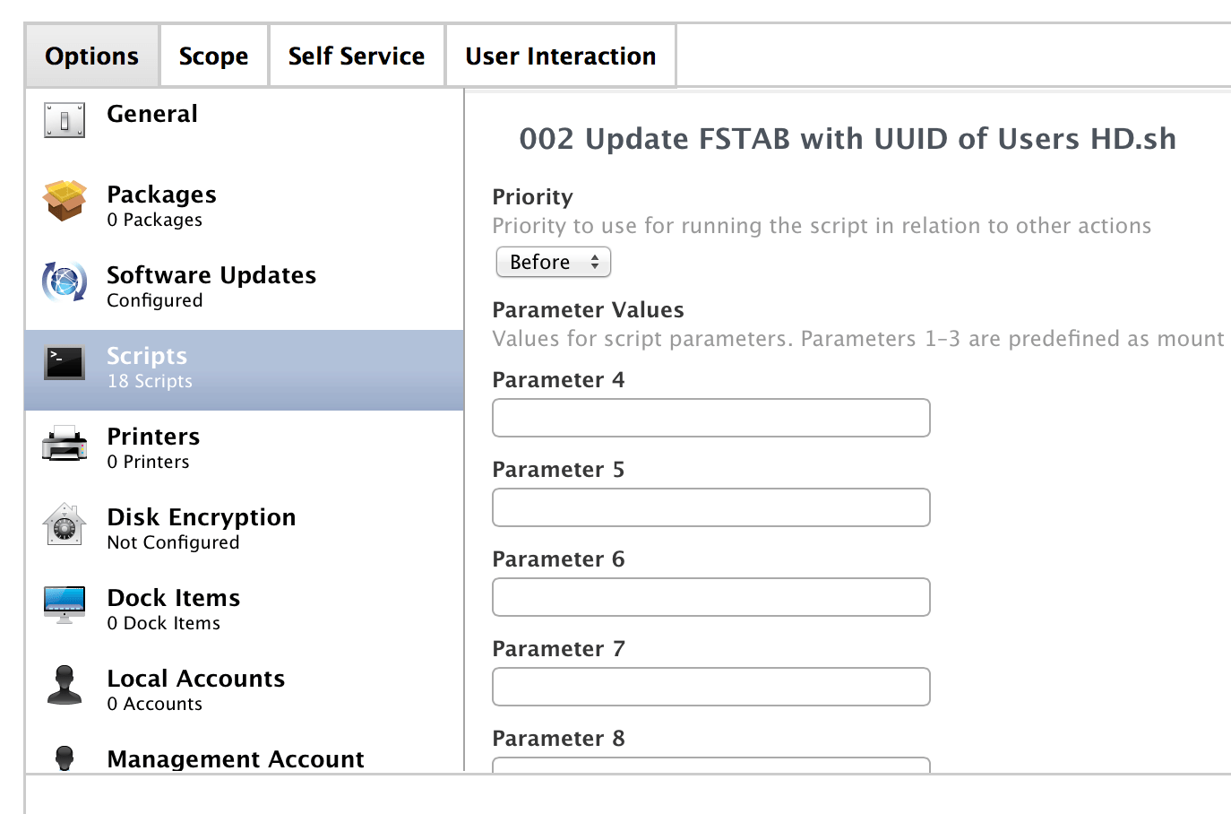 These are set to “Before” or “After” depending on what the script is, for example you could have a “Before” script that sets the Macs time to your NTP. Then an “After” script that does the “AD Binding”.